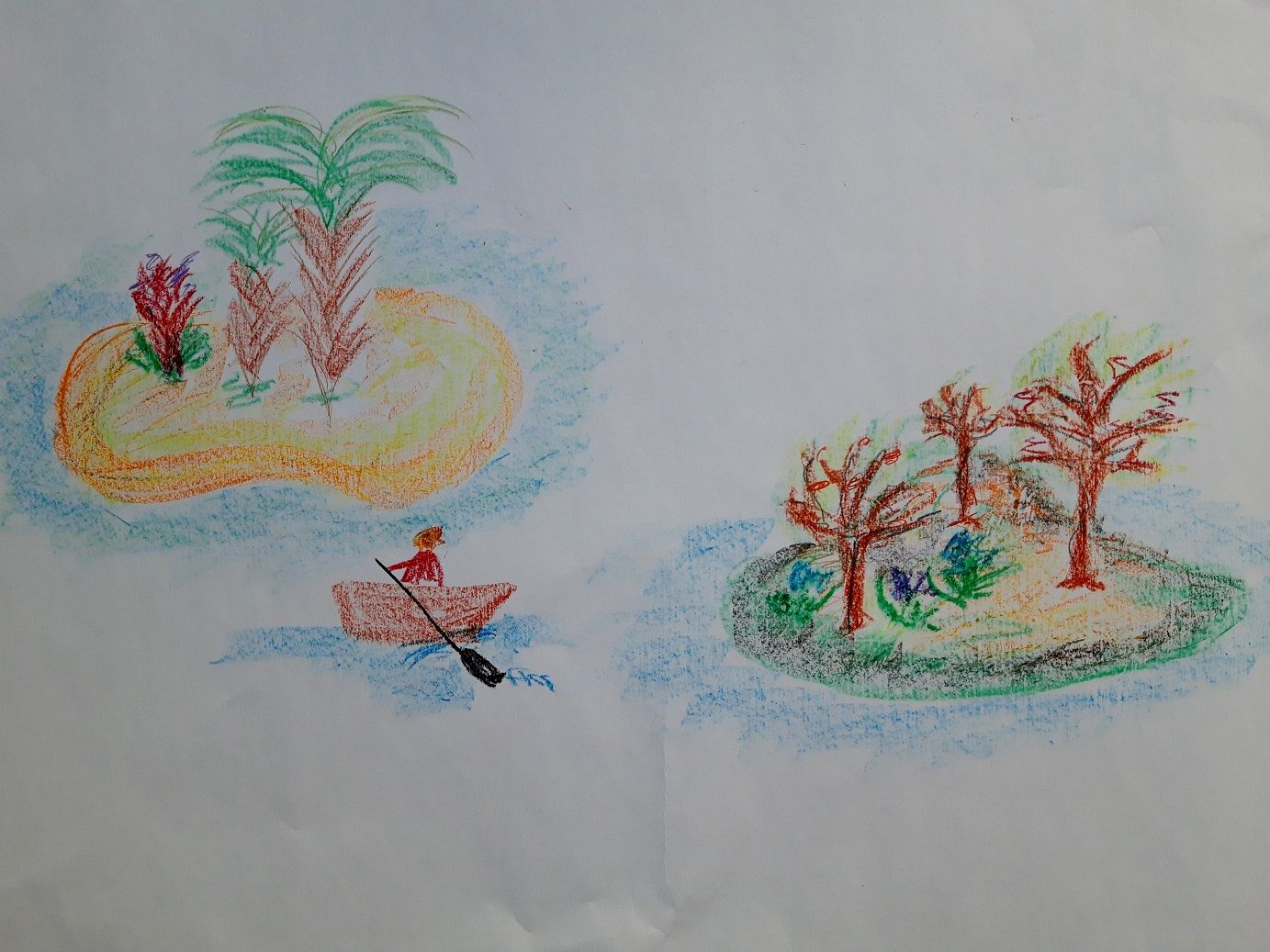 Stellt Euch eine Insel vor. Auf dieser Insel wachsen vielleicht Palmen, es gibt weißen Strand und besonders große und farbige Blumen. Insgesamt ist die Insel ziemlich flach. Türkisfarbenes Wasser plätschert in kleinen Wellen an den Strand. Ortswechsel. Eine andere Insel. Dort gibt es Berge und Bäume mit knorrigen Ästen, insgesamt ist alles saftig grün. Die Blumen tragen sehr große Blüten und große Blätter. Die Küste ist eher ein Ufer, das Wasser blau. Zwei Orten, die sehr verschieden sind. Diese beiden Inseln können für das Innenleben von zwei Menschen stehe, mit seinen Werten, Erfahrungen, Gefühlen und Ansichten.