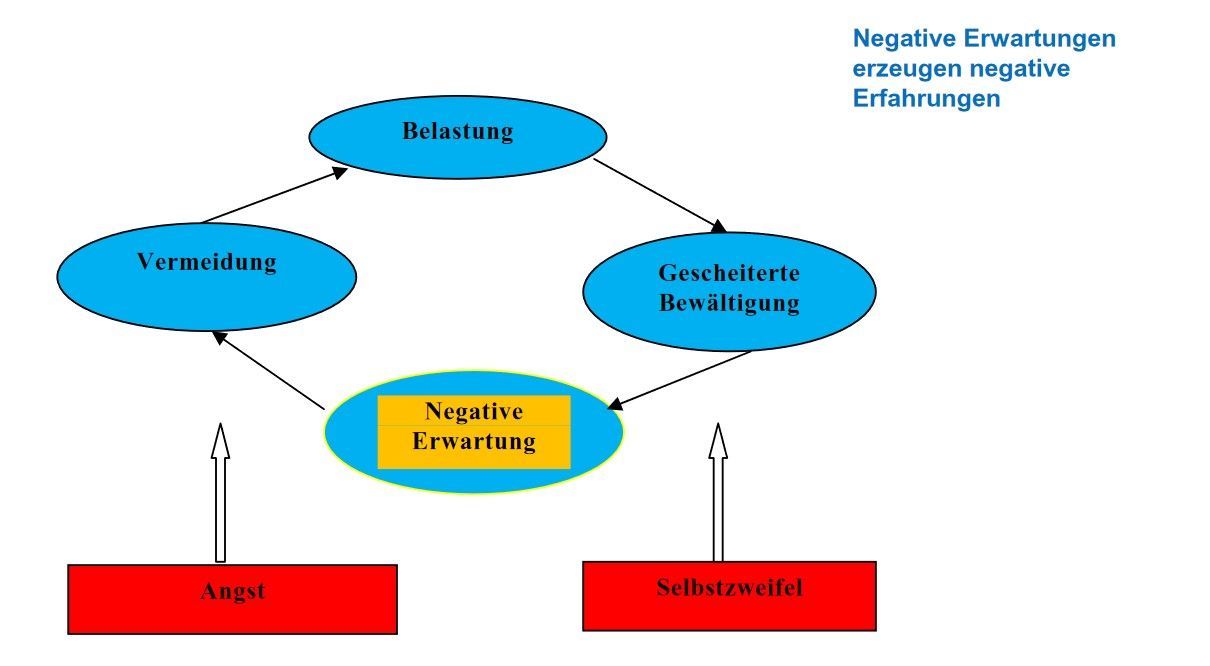 Vgl. Hüther (2006): "Angst und Selbstzweifel führen eher zur Vermeidung von neuen Herausforderungen. Die vom Kind empfundene Belastung erhöht die Wahrscheinlichkeit des Scheiterns, verstärkt die negativen Erwartungen und bestätigt Angst und Selbstzweifel." (Landesjugendamt, 18)