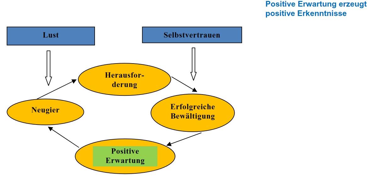 Vgl. (Hüther, 2006): "Die positive Erwartung seitens der Bindungsperson fördert Lust und Neugierde auf die Herausforderung beim Kind. Unterstützt vom eigenen Selbstvertrauen gelingt dem Kind die Bewältigung. Der Erfolg stärkt das Interesse an neuen Herausausforderungen. (Landesjugendamt, 17)